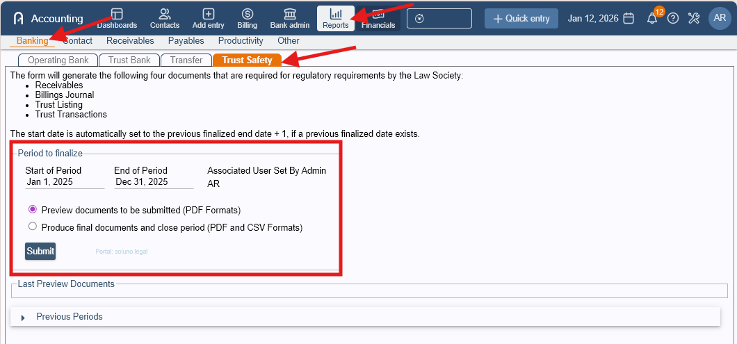 Running a Trust Safety Report locks the accounting entries, similar to a Bank Reconciliation or GST/HST report.