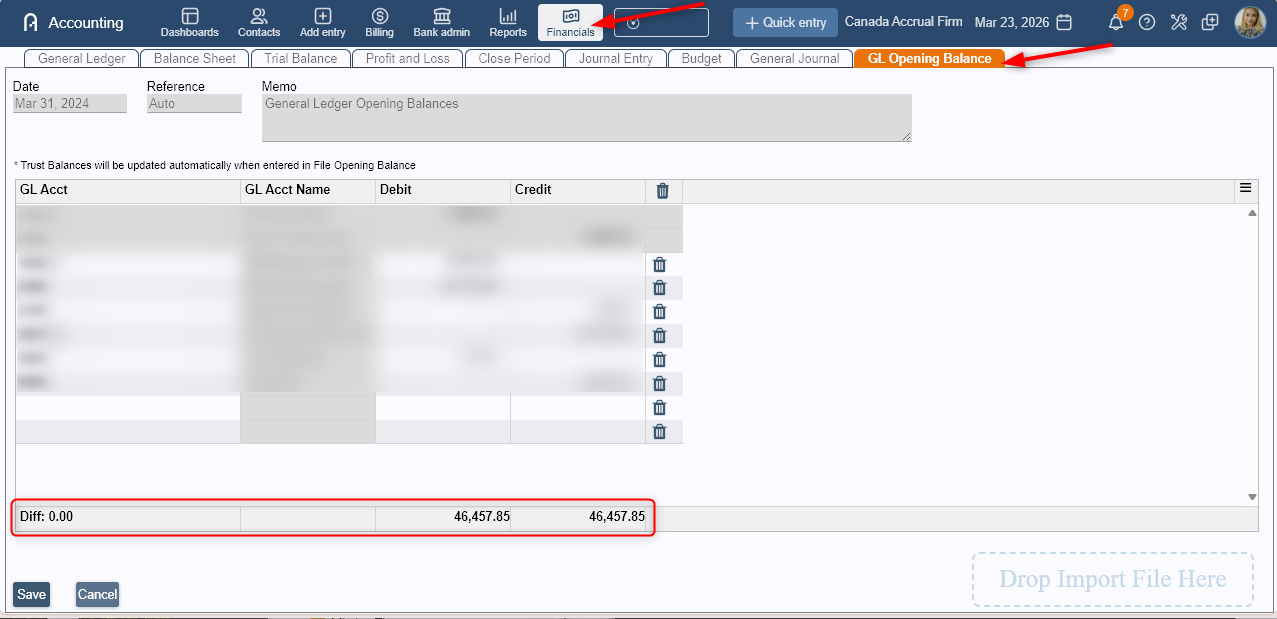 NOTE: If you have a .CSV file of GL Opening Balances, you may drop import file into Legal Accounting.