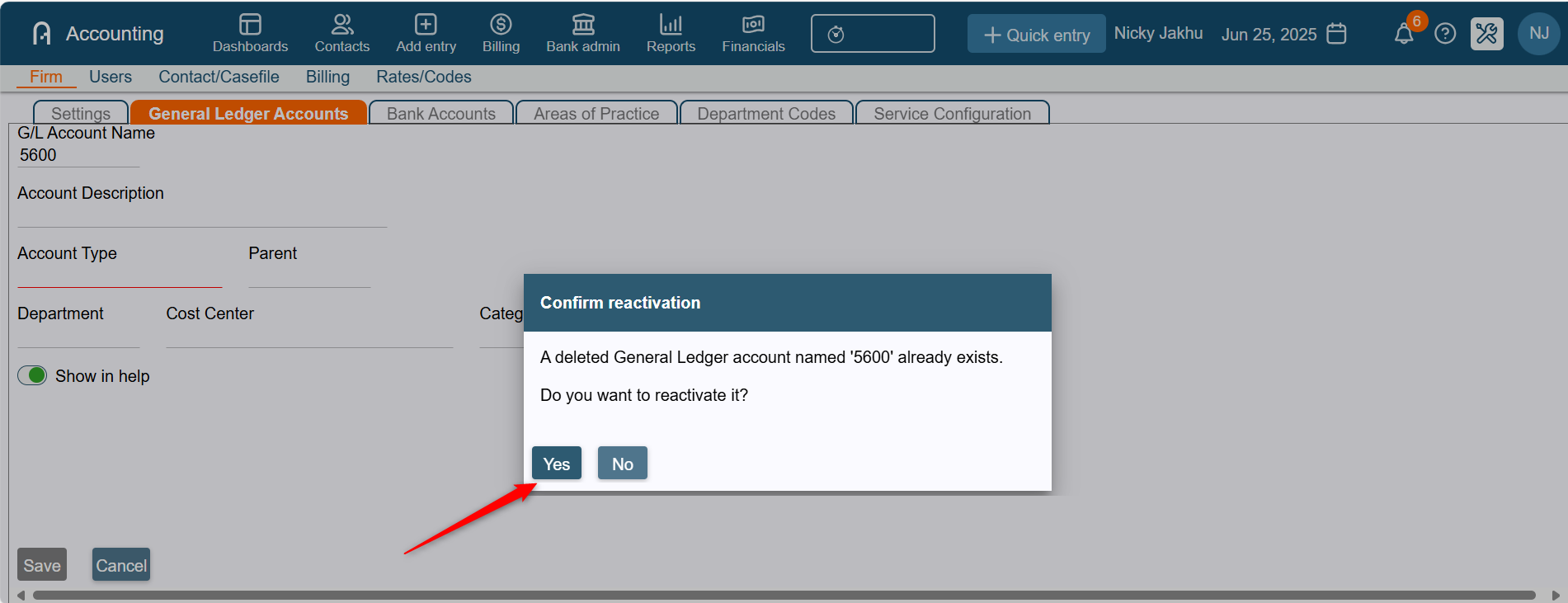 - Fill in the details.NOTE: If the GL you're trying to add is already in the system and was deleted/archived, you get a pop-up asking if you want to reactivate it, say Yes to add it back.