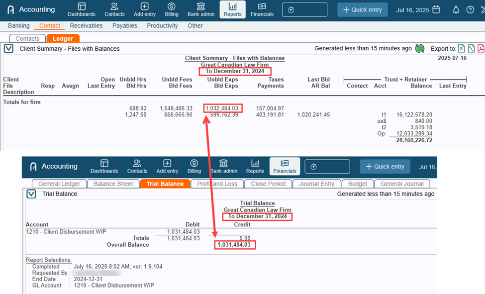 This guide helps you reconcile your Client Summary report to the Client Disbursement WIP General Ledger account. Depending on your firm settings there may be one or two GLs to combine to get to the value needed. If your account balances aren't matching up, try these steps to troubleshoot.