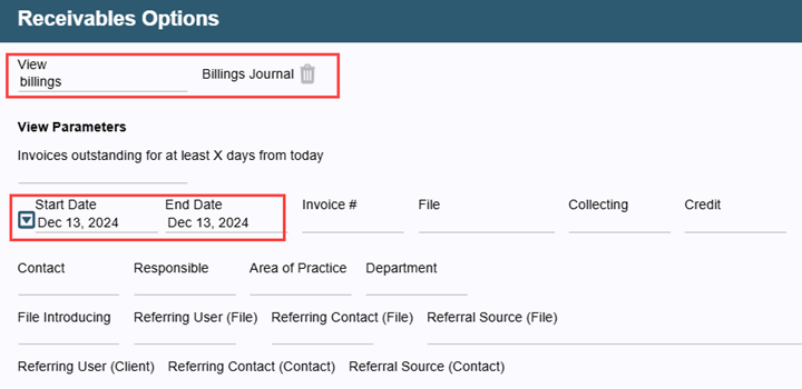 - Run a Billings Journal report located at Reports > Receivables > Receivables > billings for that specific date: